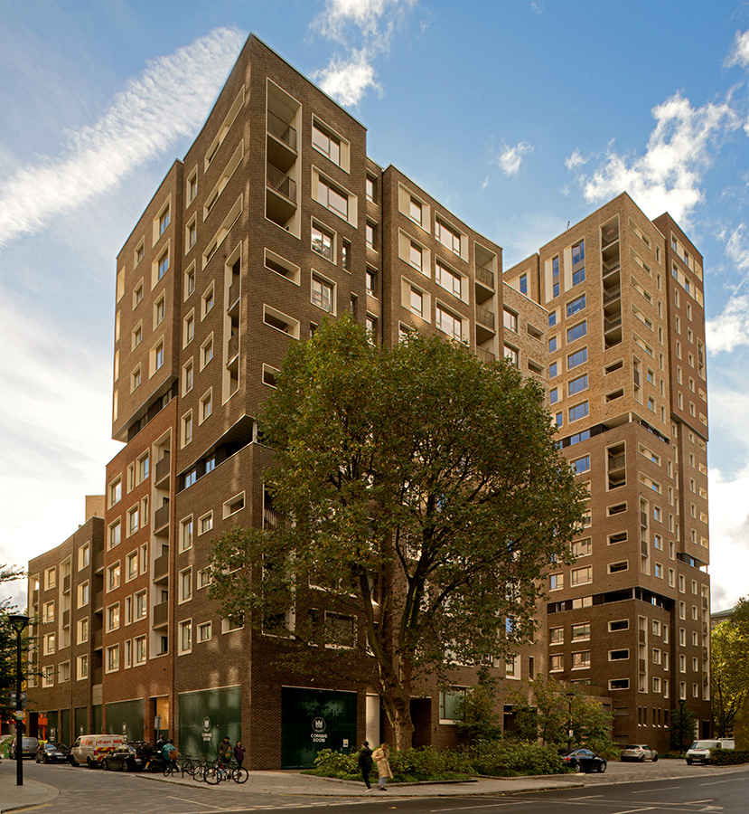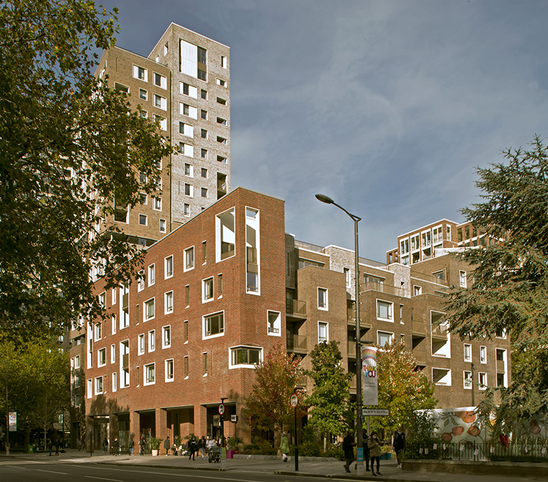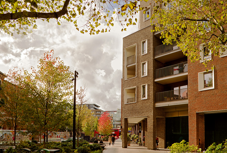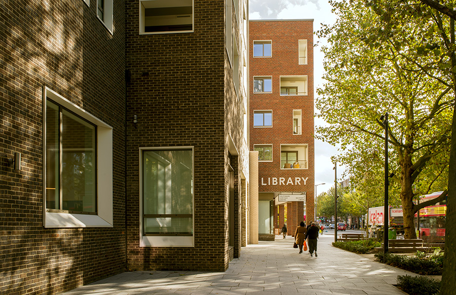 The scheme comprises 228 homes above ground floor retail and the new Southwark Heritage Centre and Walworth Library. Walworth Square connects Orchard Gardens to the Old Town Hall on Walworth Road.